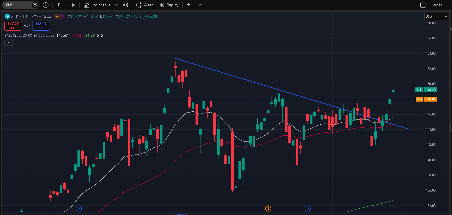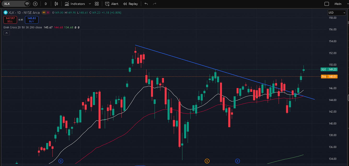Clear breakout and some daily gapping right on cue. Relative to the other sectors, XLK has some ground to make up, and we all know that once tech starts catching a bid things can really move fast. MSFT gapping down on earnings has me a bit suspicious about the overall health of the market and MAG 7’s ability to fuel another run up. On the other hand all bearish sentiment has been getting invalidated repeatedly, so it’s hard for me to take a stance there. If I had to chose right now I would say XLK to highs sounds pretty likely. Earnings and price action will tell the story over the next couple of weeks.